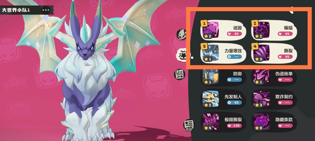 叮叮恶魔技能搭配和打法:热身运动+ 趁火打劫+ 三连破+任意技能。开局放热身运动,然后接趁火打劫,等boss背击回合再叠热身运动,其他回合就三连破和趁火打劫交替放。 翠顶夫人技能搭配和打法:等价交换(改恶系血脉)+天光(白金独角兽图鉴课题奖励)+润泽(圆号鱼图鉴课题奖励)。