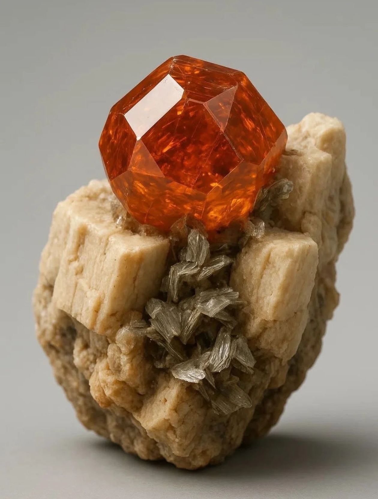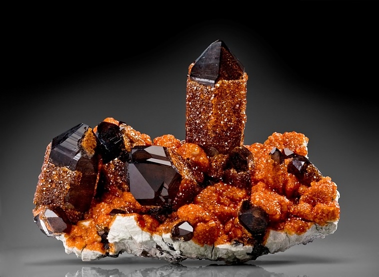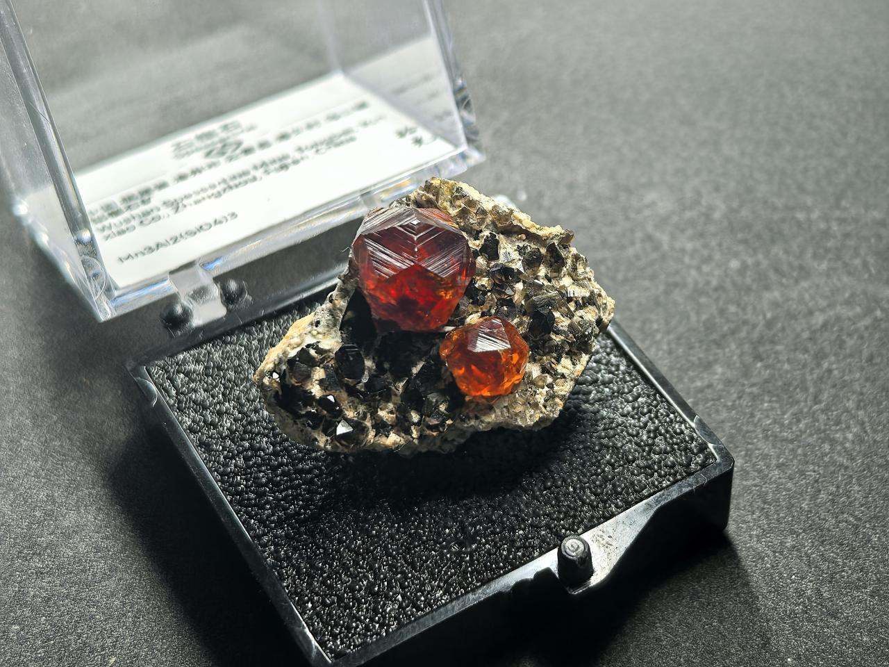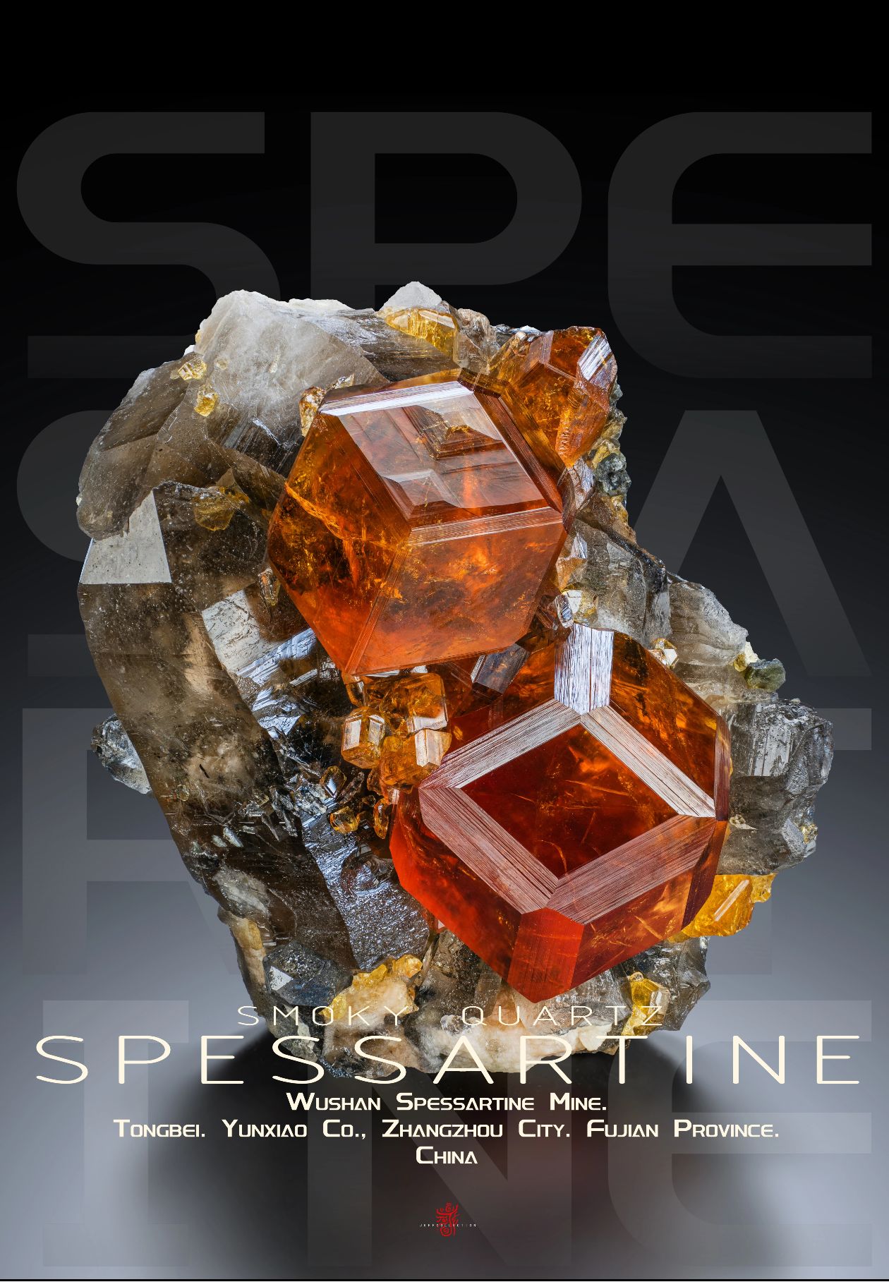 1998年,中國礦物寶石交易市場上首次出現了一種石榴石礦物標本,石榴石晶體呈光豔無比的橘紅色,而且與菸灰色的水晶以及長石共生在一起。