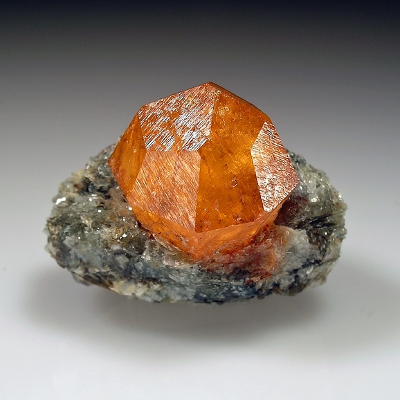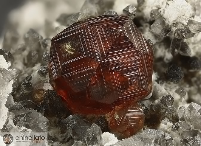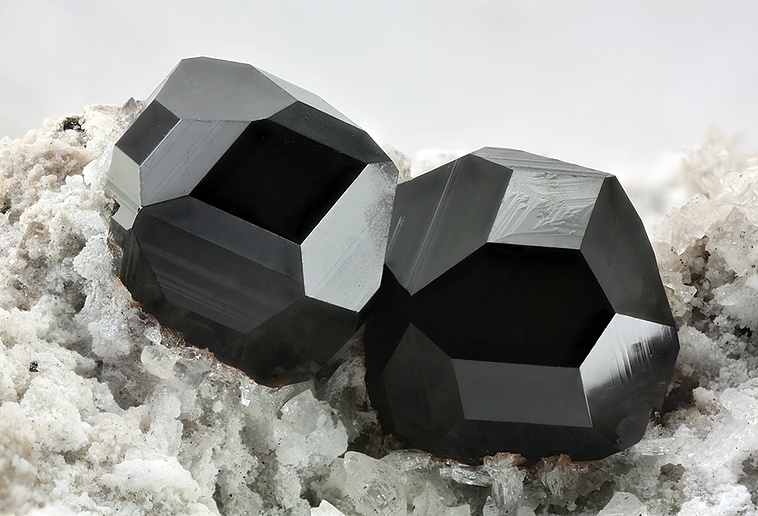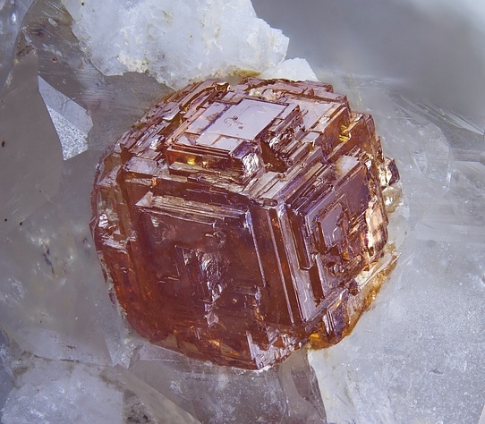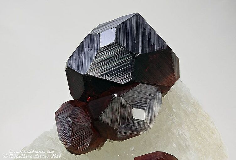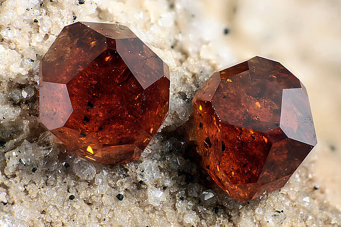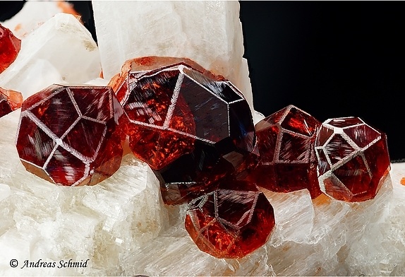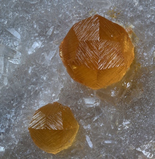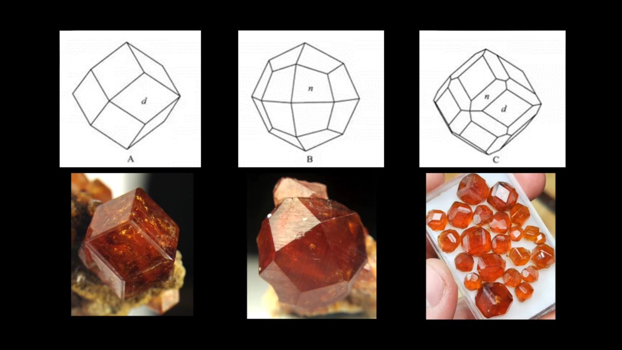 然後呢,在晶體結構上,石榴石都屬於等軸晶系,錳鋁榴石也不例外。因爲它們是硅酸鹽礦物中的島狀硅酸鹽礦物,這種結構的特點是硅氧四面體各頂點並不相連,所以,它們也通常呈現菱形十二面體,四角三八面體以及他們的聚型,和六八面體。