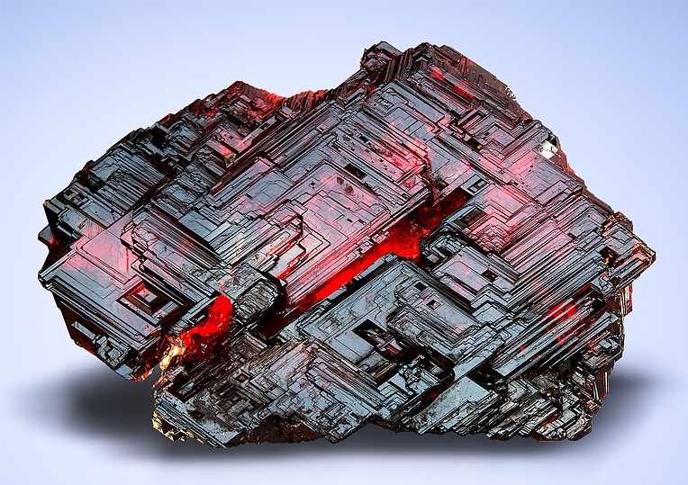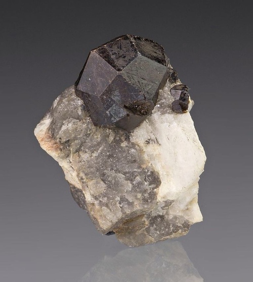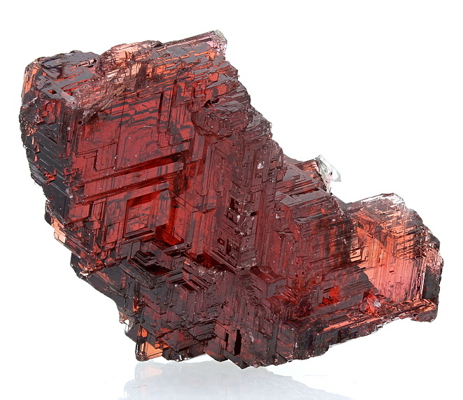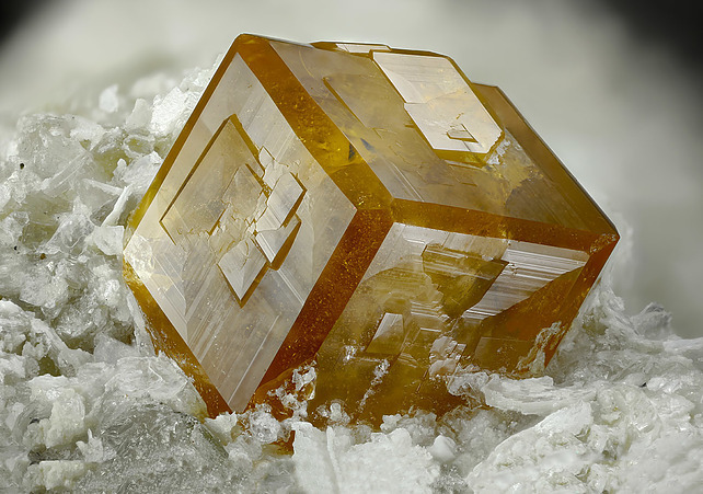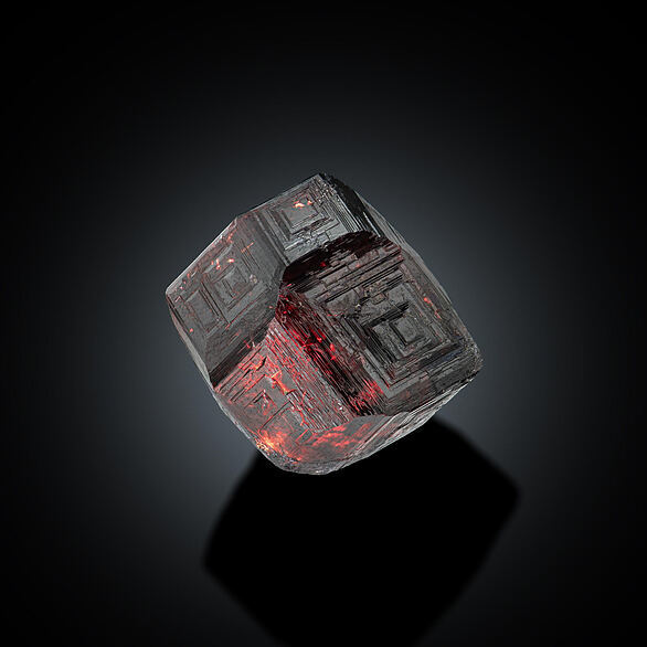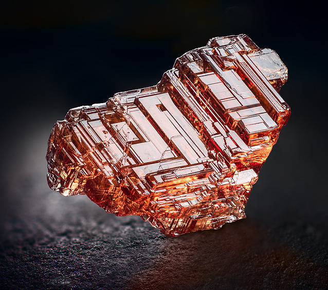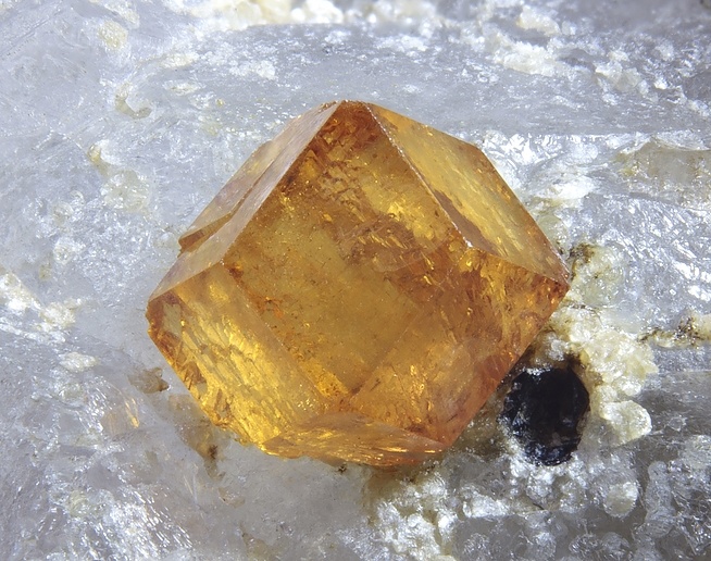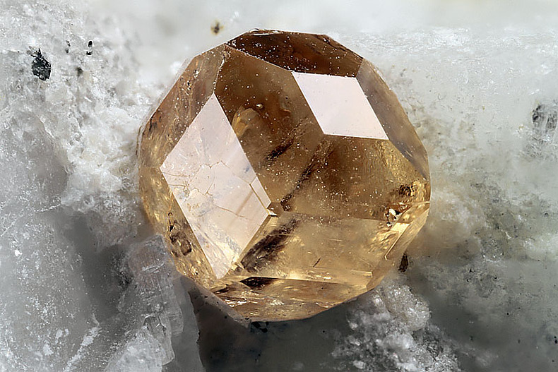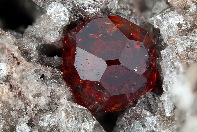 然後呢,在晶體結構上,石榴石都屬於等軸晶系,錳鋁榴石也不例外。因爲它們是硅酸鹽礦物中的島狀硅酸鹽礦物,這種結構的特點是硅氧四面體各頂點並不相連,所以,它們也通常呈現菱形十二面體,四角三八面體以及他們的聚型,和六八面體。