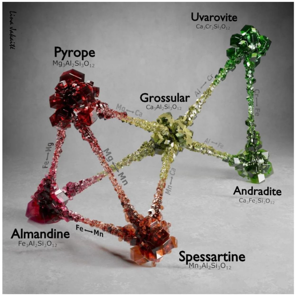 錳鋁榴石、鎂鋁榴石(Pyrope)、鐵鋁榴石(Almandine)。