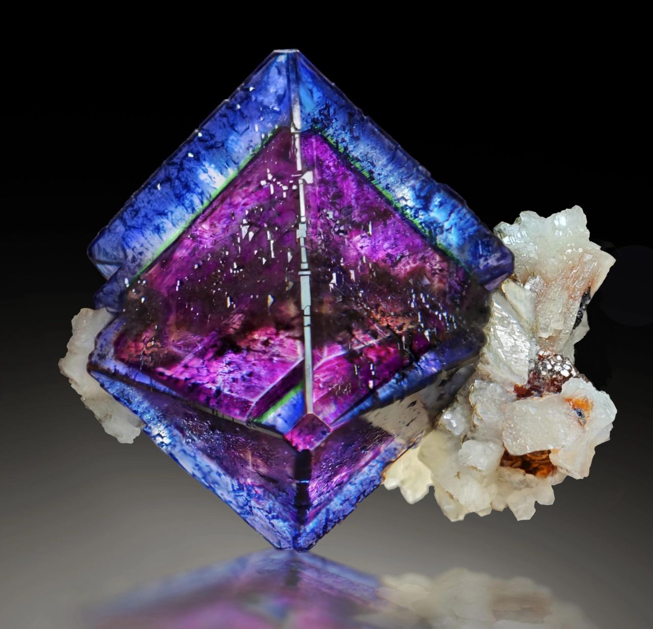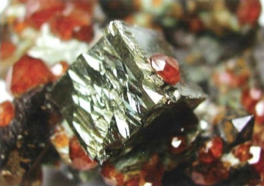 它們步伐輕盈,帶着那抹輕佻的橙紅,時而伴隨長石左右,時而與螢石起舞,跳累了,就趴在黃鐵礦上沉眠。當光陰流轉,歲月如梭,時間扒開了沉寂的圍巖,人們驚訝的發現,它們身上的光芒不比身側的黃鐵暗淡,這種豔麗的色彩和擁擠的身形,恰似秋天那碩果累累的石榴,充滿着甜蜜與幸福。