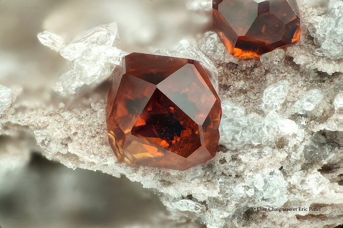 這裏的錳鋁榴石通常跟電氣石共生。顏色爲米黃或是棕色色調。外型鋒利,晶體飽滿,坐落在雪白的石英底巖上。