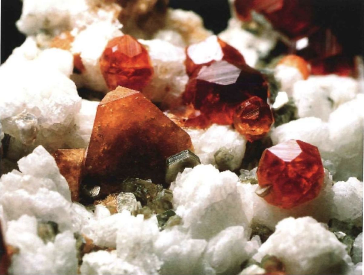 圖中橙色的就是日光榴石,與白色的鈉長石,紅色錳鋁榴石共生