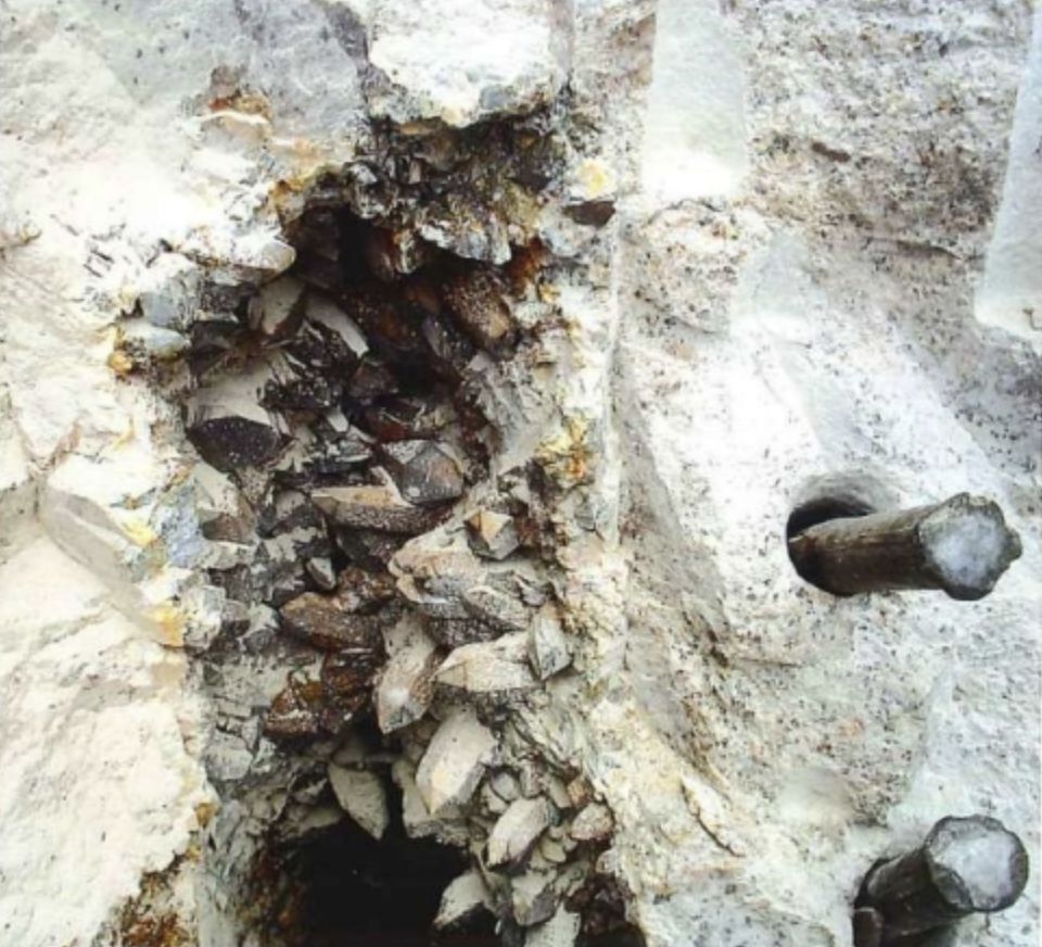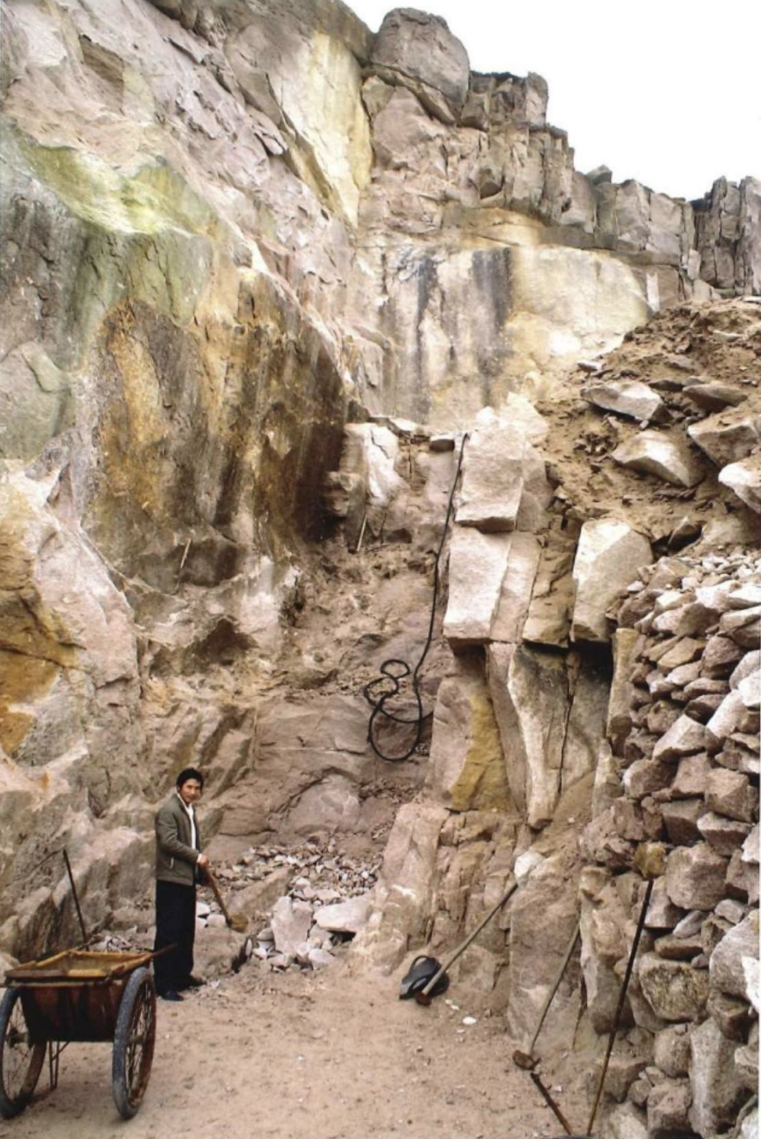 採礦工人先使用以汽油爲動力燃料的鑽機在巖體上鑽好炮眼,然後填人足夠的炸藥,一炮轟過,大片花崗岩體滾下山坡。