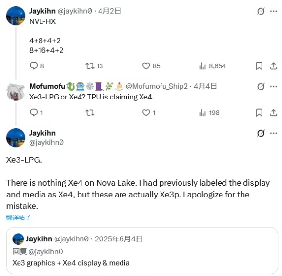 移动端与全系列 Nova Lake 处理器的核显规格也同步敲定,关于 Xe3 与 Xe4 架构的争议尘埃落定,Nova Lake 全系列不会采用 Xe4 GPU,统统属于Xe3P 分支。多数版本 Nova Lake 处理器搭载 Xe3 图形引擎,面向移动高性能场景的 Nova Lake P 升级为 Xe3P 图形引擎,不同后缀产品(NVL-S、NVL-U、NVL-H、NVL-HX、NVL-UL)均基于 Xe3 系列架构优化,无 Xe4 架构适配计划。