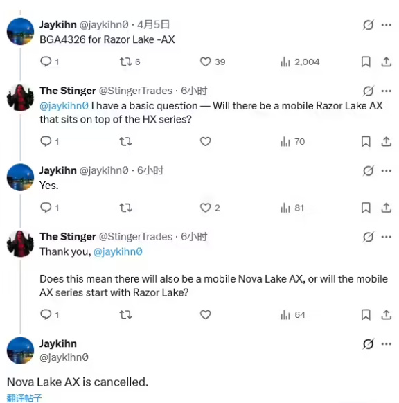 同时调整高端产品规划,正式取消 Nova Lake 系列的 AX 高阶版本,原本计划在 Nova Lake 推出的 AX 系列处理器将延后至下一代 Razer Lake 平台登场。有传闻Razer Lake-AX 处理器将采用 BGA4326 接口,且移动端 AX 系列也将从 Razer Lake 开始,Nova Lake 全系列不再有 AX 版本规划。