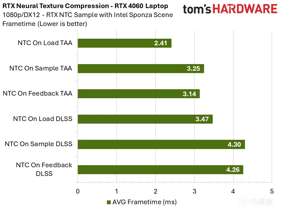 加载时推理将 NTC 纹理转码为 BCn,与传统块压缩相比零性能开销;而采样时推理需要实时执行神经解码,会在所有显卡上产生性能成本,理想情况下这一开销应尽可能小。