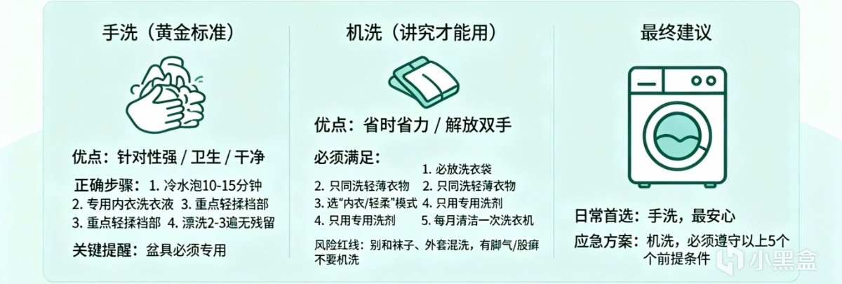 手洗的好处是:针对性强,可以重点揉搓裆部;水温可控;不混洗,杜绝交叉感染。