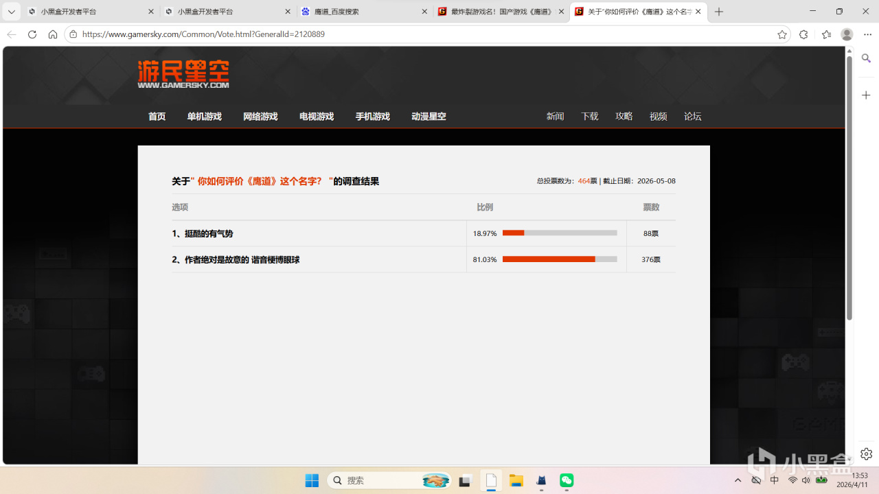 另外,知名“游民星空”游戏网站也非常关注《鹰道》游戏,不但建立了游戏商店页面,最近也对《鹰道》游戏命名情况进行了网友回帖模式民意大测评,统计结果显示,三分之二以上接近80%的网友觉得是官方存在故意使用谐音命名博取流量嫌疑。