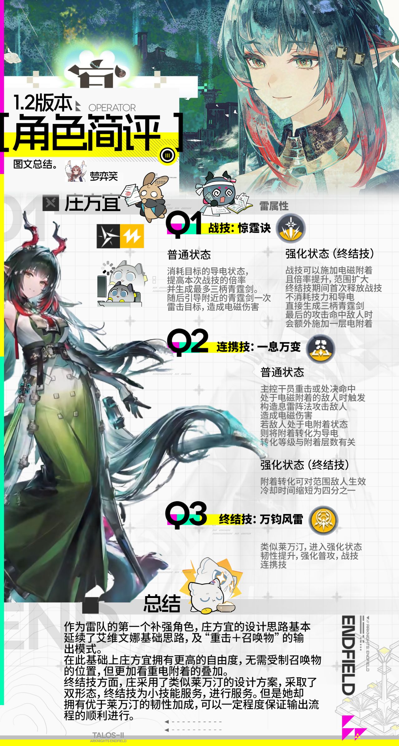 但是终结技类似莱万汀的强化双形态设计,拉长了输出流程(对比莱万汀还是快的,莱万汀强在本身的数值高,机制算不上特别优秀,而且庄方宜终结技有额外的韧性加成,这是莱万汀设计上缺失的。),使得版本最优的法术拐洁尔佩塔无法很好的与其搭配,一轮爆发尚且可以覆盖,但是之后的流程存在真空。(未来等专拐解决吧)