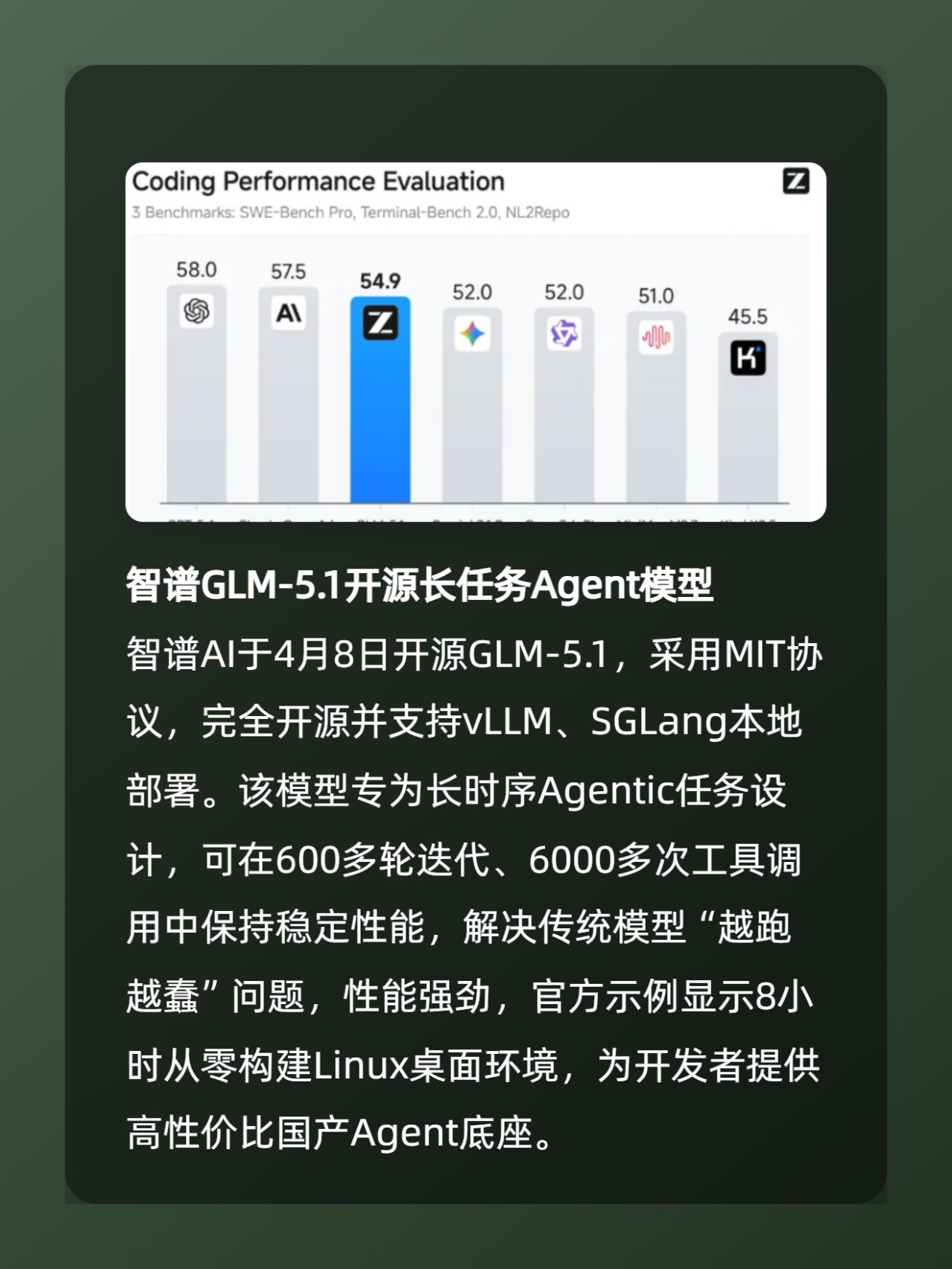 · 智譜AI開源GLM-5.1長時序Agent模型,MIT協議完全開源,在SWE-Bench Pro等基準大幅領先,支持600輪以上工具調用和長上下文,適合複雜編程與Agent工程;