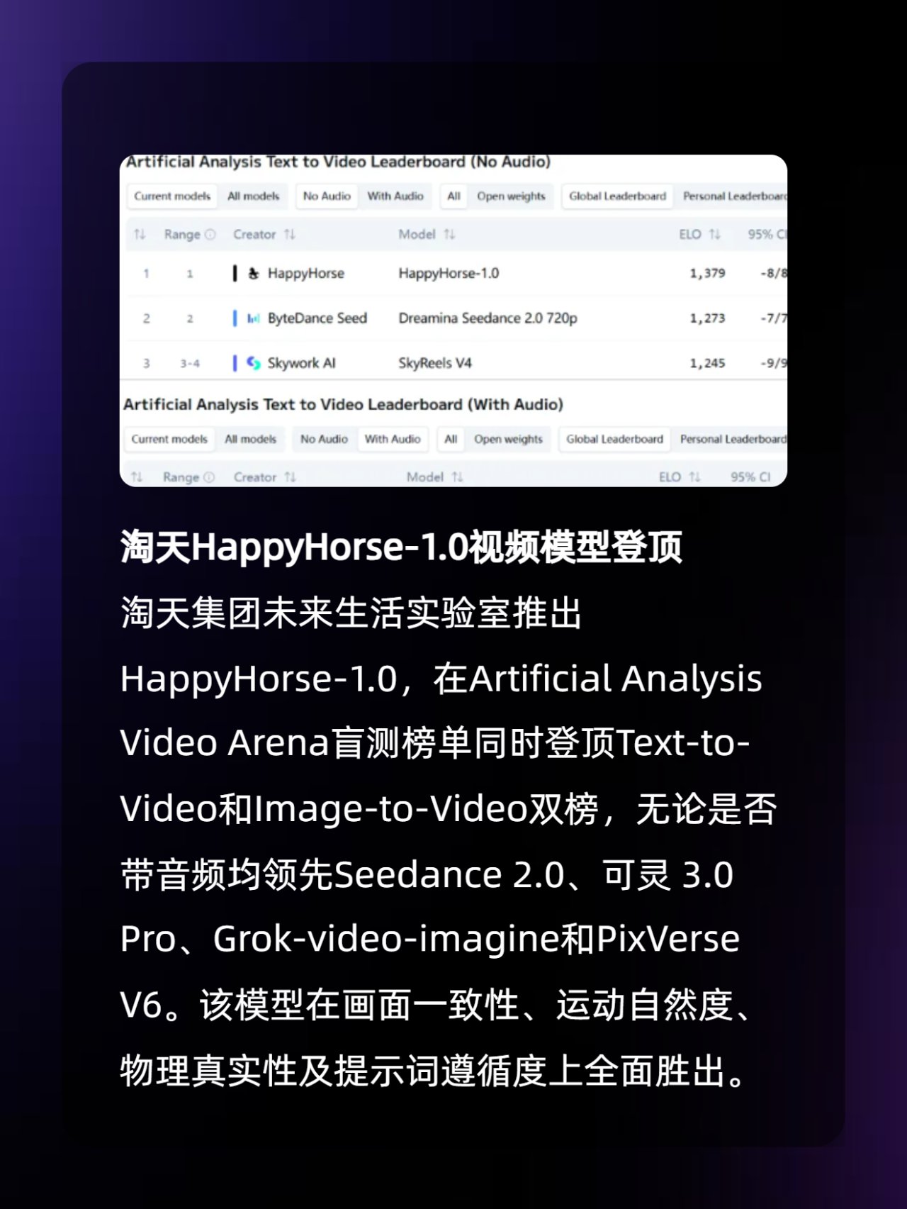 · 淘天集團HappyHorse-1.0視頻模型在Artificial Analysis Video Arena盲測榜單登頂Text-to-Video和Image-to-Video雙榜,全面領先Seedance 2.0等競品,在運動自然度、物理真實性和提示詞遵循度上表現突出;
