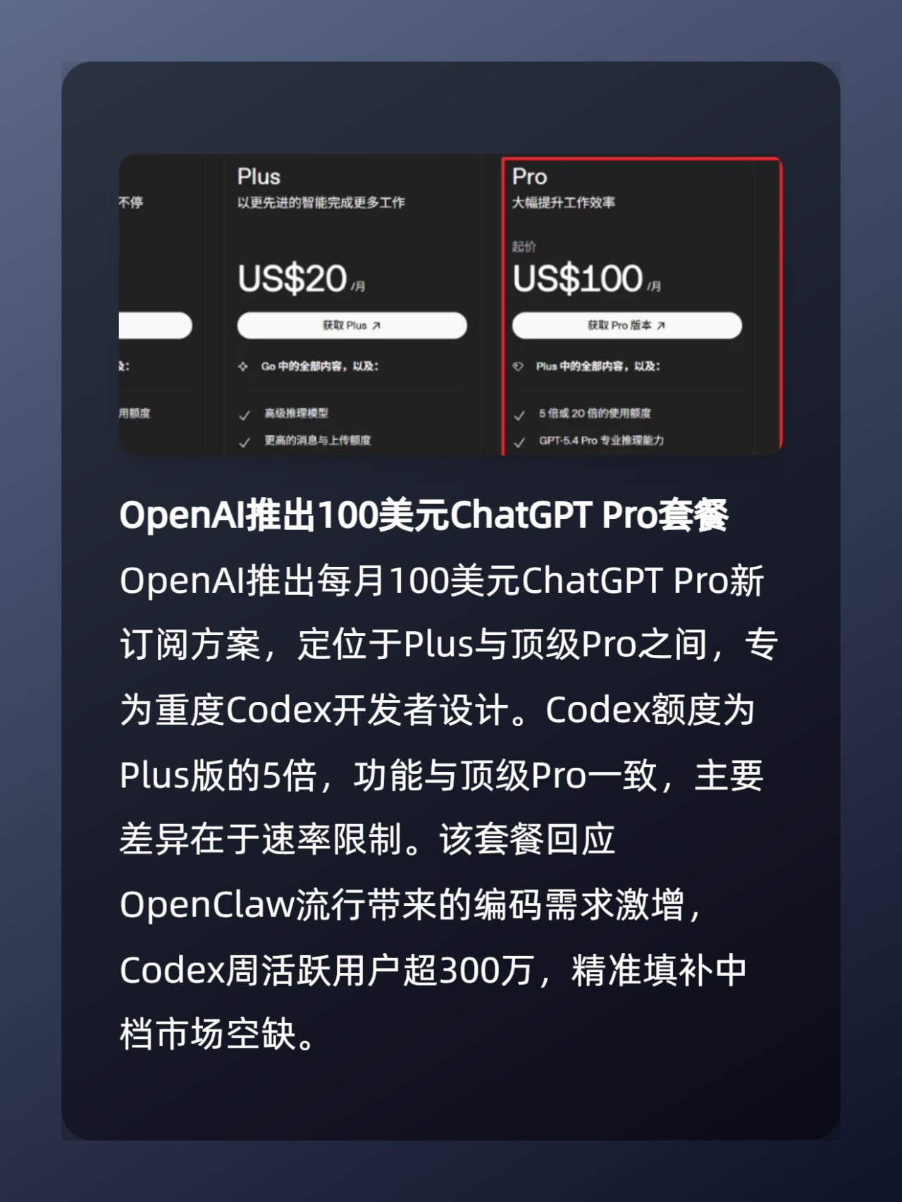 · OpenAI推出每月100美元ChatGPT Pro新套餐,Codex額度爲Plus版5倍(新用戶10倍),針對重度編碼用戶提供無限Instant/Thinking模式,填補中檔訂閱空缺。