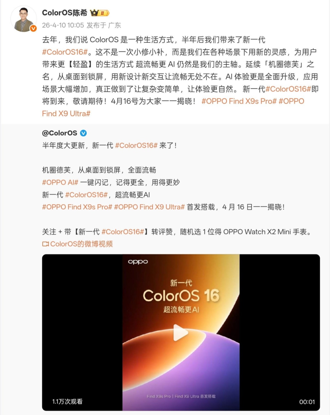 新一代 ColorOS 16 將於 4 月 16 日發佈,是一個半年度大更新,將由Find X9s Pro和X9 Ultra首發。