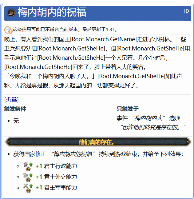 要是你運氣很好,觸發了梅內胡內的祝福的事件,那麼會給你一個非常強力的修正,未來的君主所有屬性全部加一。