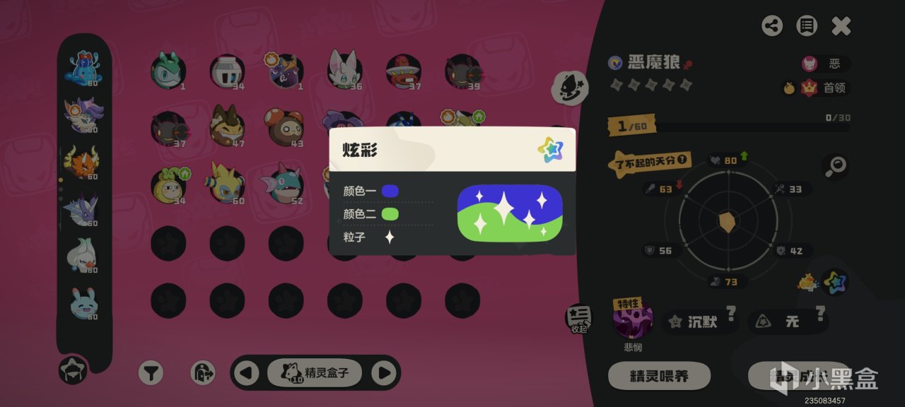 第二就是游戏的各种精灵收集,除了天分性格等影响数值,其他当然是精灵炫彩和异色,炫彩不固定颜色,而异色是官方固定,两词条互不冲突。炫彩基本要靠棱彩球抓概率太飘忽,而异色有游戏保底(通过大量捕抓出80个污染),这几天我为了迎合活动“治愈兔大量出没”都抓了很久直到精灵球抓完了,才出了这个异色。所以就算是收集党养老的也能针对自己喜欢的精灵抓异色和炫彩。可玩性是够的,但好不好玩就另外说。