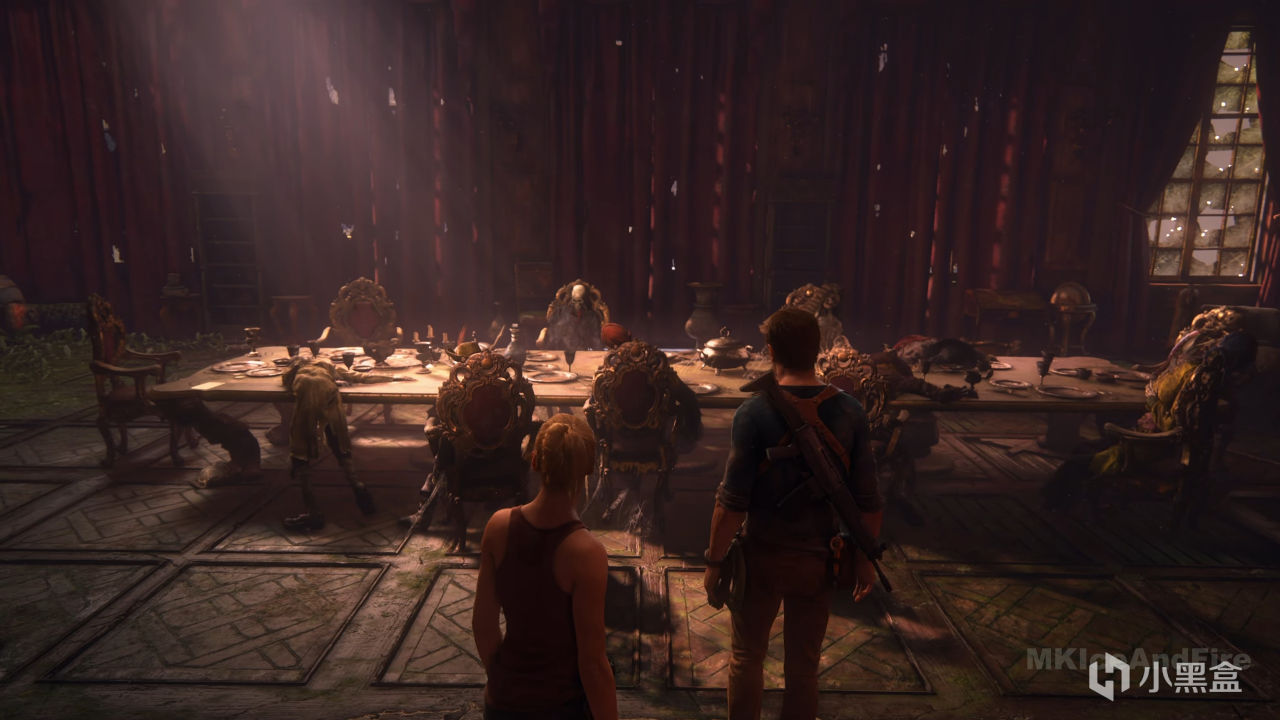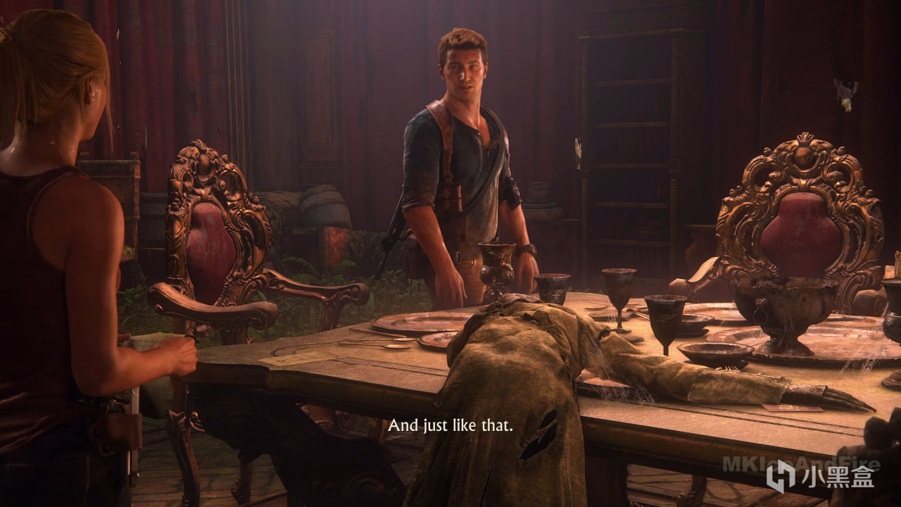 这种让空间自己说话的手法,《最后生还者》里到处都是——废弃房屋里的字条、超市货架上的弹痕、某个角落两具相拥的尸体。顽皮狗在末日题材里磨了几年的环境叙事功夫,全带进了《神秘海域4》。