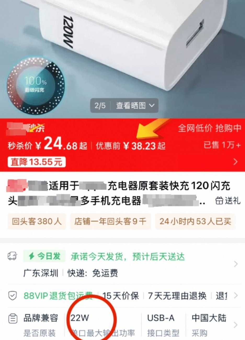 所谓的“120W”,并非指充电器的充电功率,而是部分商家注册的产品商标或型号 。这些充电器在外观上用巨大字体突出“120W”,宣传语也充满“超级闪充”、“极速满电”等误导性词汇,但在商品详情页的极小字体中才标注其真实功率,通常仅为12W至22.5W 。