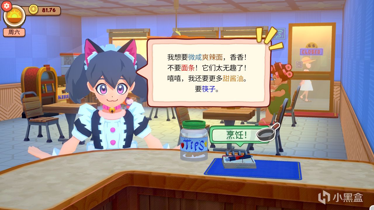 游戏里一周共有5天工作时间,周一和周四为休息日。开店后会迎来多个客人,每个客人的要求也是千奇百怪,比如有的要“不加豆腐的豆腐汤”,有的要“不加面条的拉面”等等,不管客人要什么,我们照做就完事了。