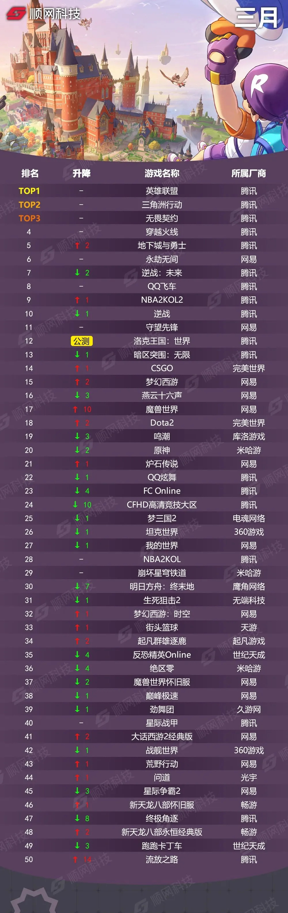 近日,顺网科技发布了 3 月网吧游戏热力榜 Top 50。