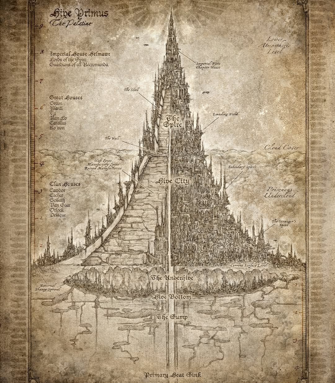 从物理形态上看,巢都通常由三个主要部分构成:尖塔(Spire)、中层巢都(Mid-hive)和底巢(Underhive),每个部分又细分为无数个功能区域,形成了一个层级分明、功能完备的城市生态系统。