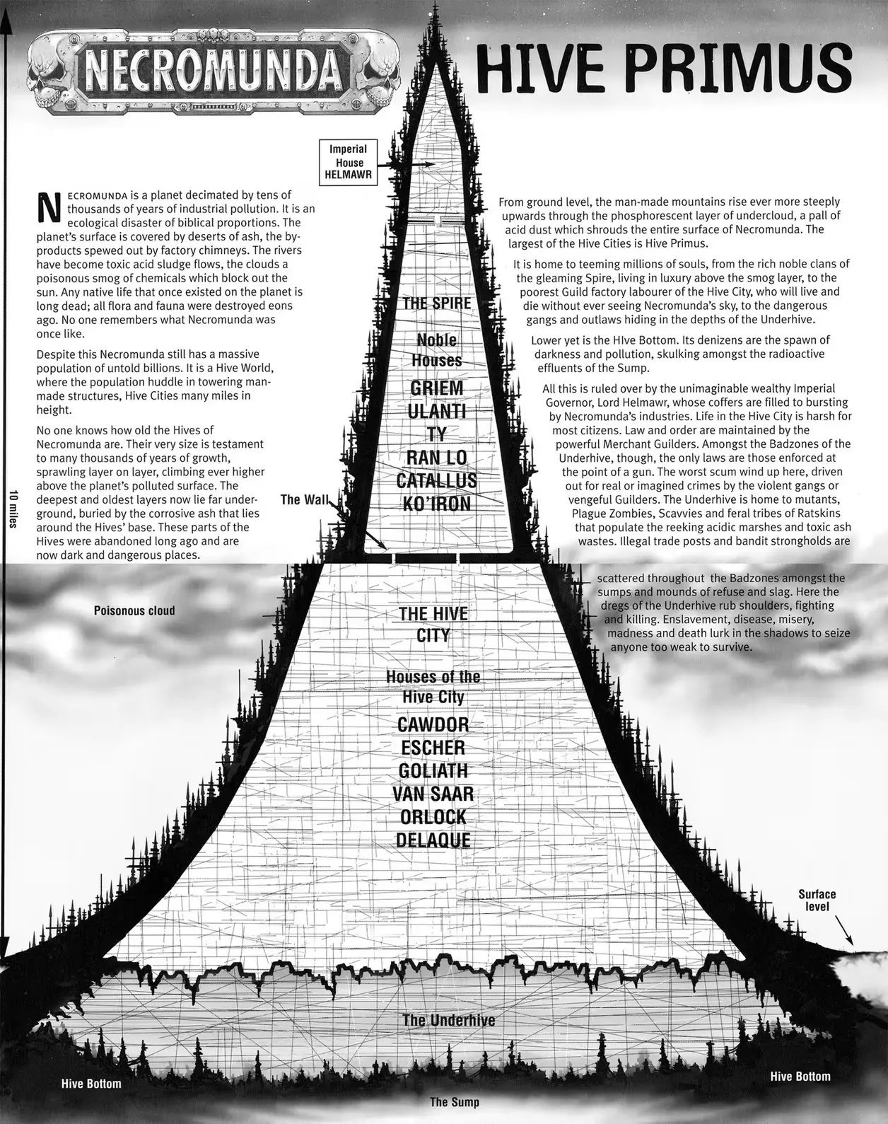 中层巢都之下是底巢(Underhive),这是巢都最黑暗、最危险的区域,也是帝国法律与秩序彻底失效的地方 。