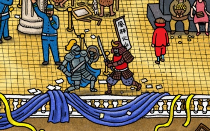 不止如此,這款尋物繪本遊戲還藏了彩蛋:一個日本武士和西方的盔甲騎士單挑,後背“風林火山”四個大字,臥槽,這不武田信玄嗎?