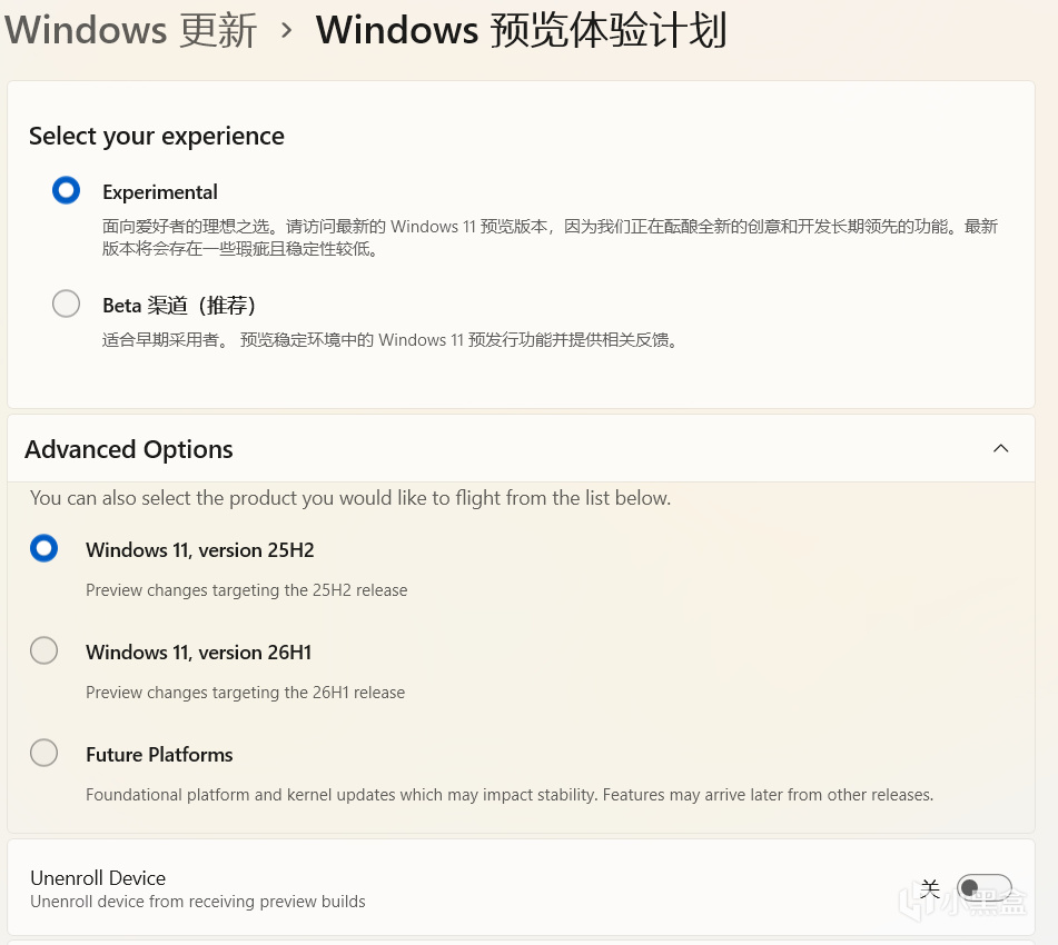 🔵 Experimental(已选中) 面向爱好者的理想之选。请访问最新的 Windows 11 预览版本,因为我们正在酝酿全新的创意和开发长期领先的功能。最新版本将会存在一些瑕疵且稳定性较低。