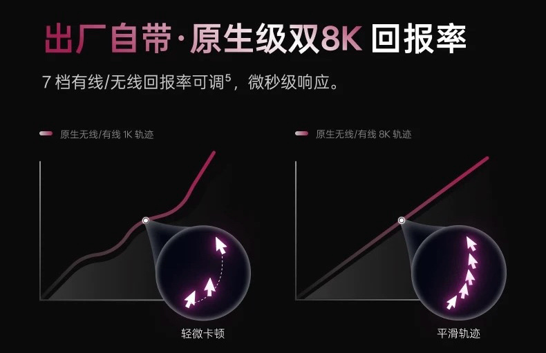 在之前雷柏发布的炎龙固件,续航提升是一方面,另一方面是VT二代系列的鼠标,标准版也拥有了≥2wFPS的静态扫描速率,更低的延迟,更爽的使用体验