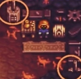 5、火山矿洞第五层矮人商店,周围有三个竖铁桶,用剑砍,可以0元薅晶石/钻石/熔岩菇/宝石机器人等