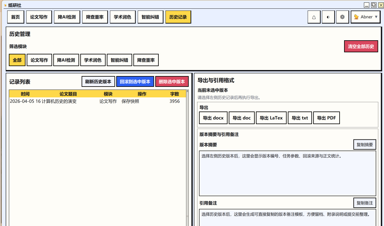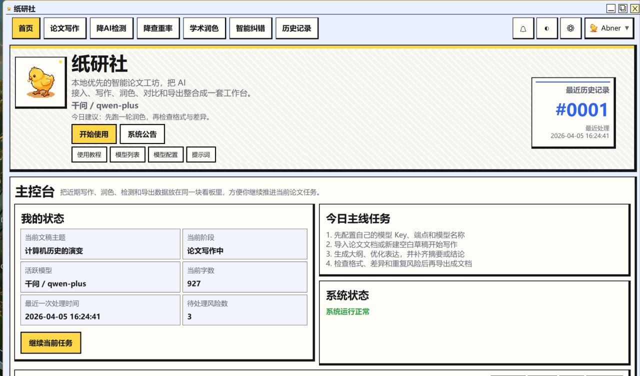纸研社是一款把论文写作、降 AI 检测、降查重、润色、纠错放进一个桌面工作台