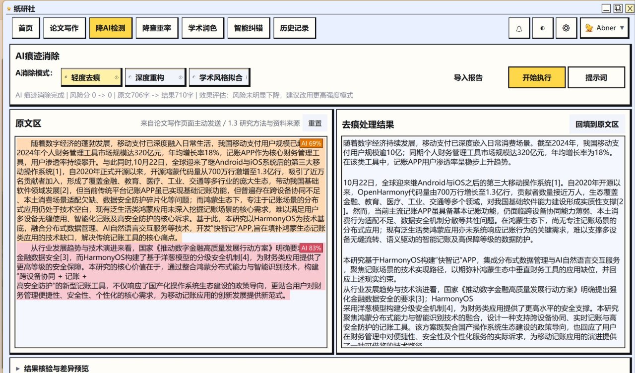 二、 降 AI 检测,纸研社提供不同强度的改写策略,并支持按段落识别风险、逐段处理内容。更重要的是,它支持导入 AIGC 检测报告,对高风险内容进行定位和着色展示。问题在哪一段,不需要自己一点点找,界面会直接标出来。