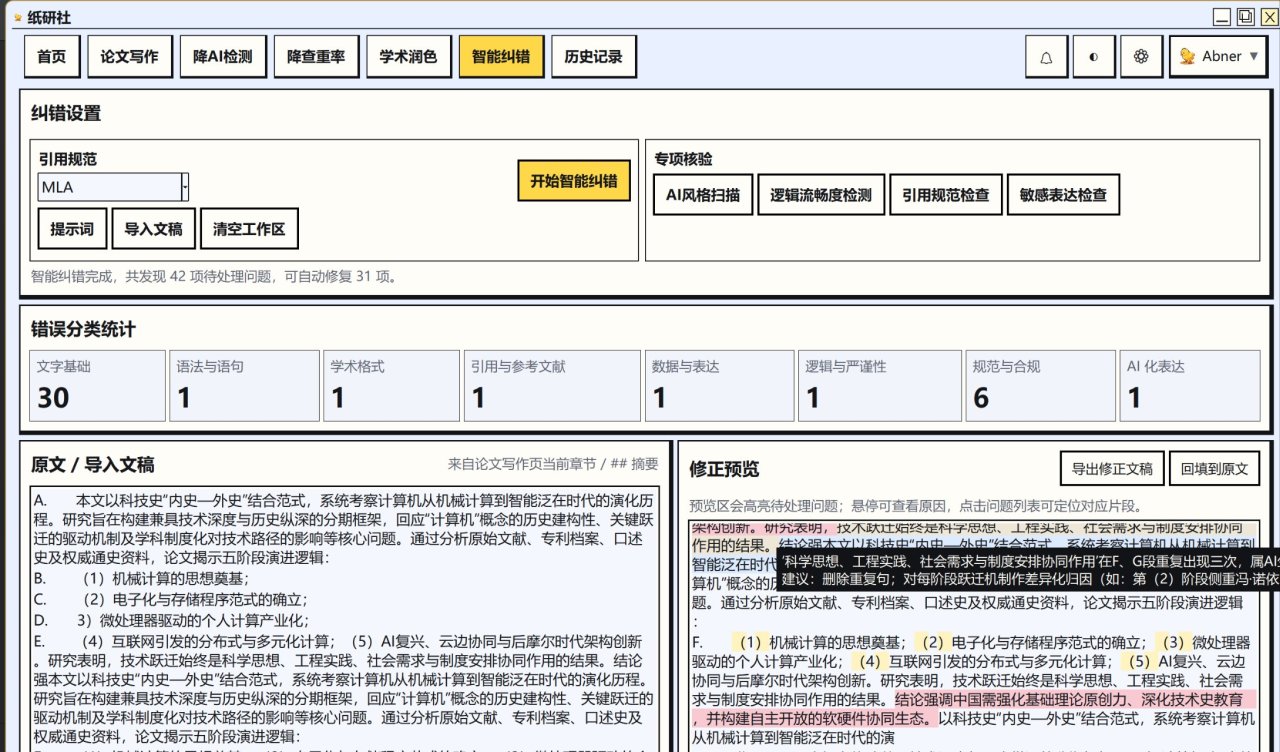 四、 学术润色和智能纠错,则进一步补齐了论文后处理阶段最耗时的工作。摘要、引言、正文、结论、大纲,可以按不同文本类型分别处理;语法、词汇、逻辑、格式、引用、数据表达、合规风险、AI 写作痕迹,也可以分维度检查。让修改更细,判断更准,输出也更接近学术写作要求,而不是一刀切地“统一润色”。