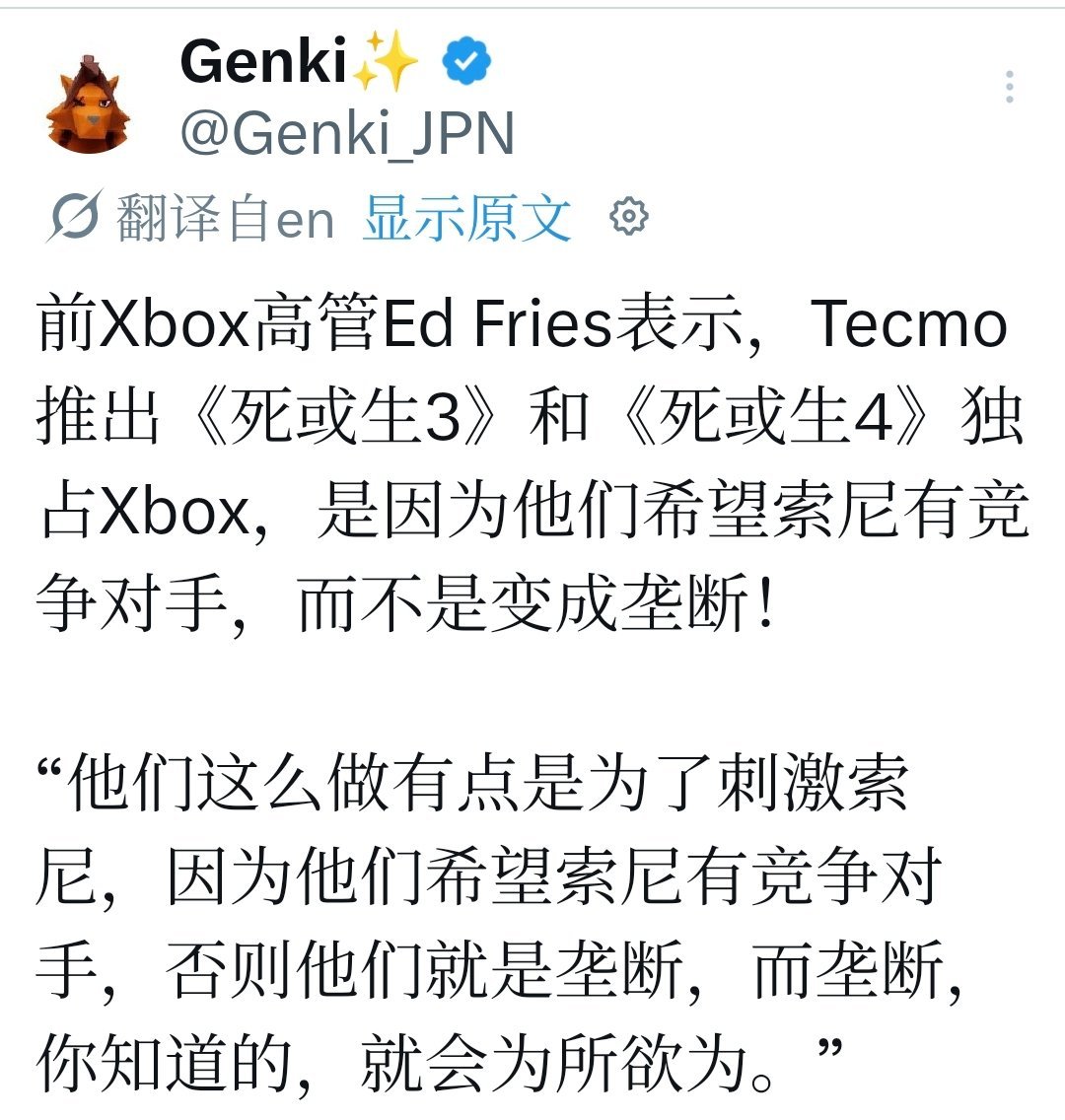 Fries特别点名Tecmo作为典型例子:Tecmo把《死或生3》和后续作品放在Xbox上。动机不是单纯商业,而是故意给索尼添堵。