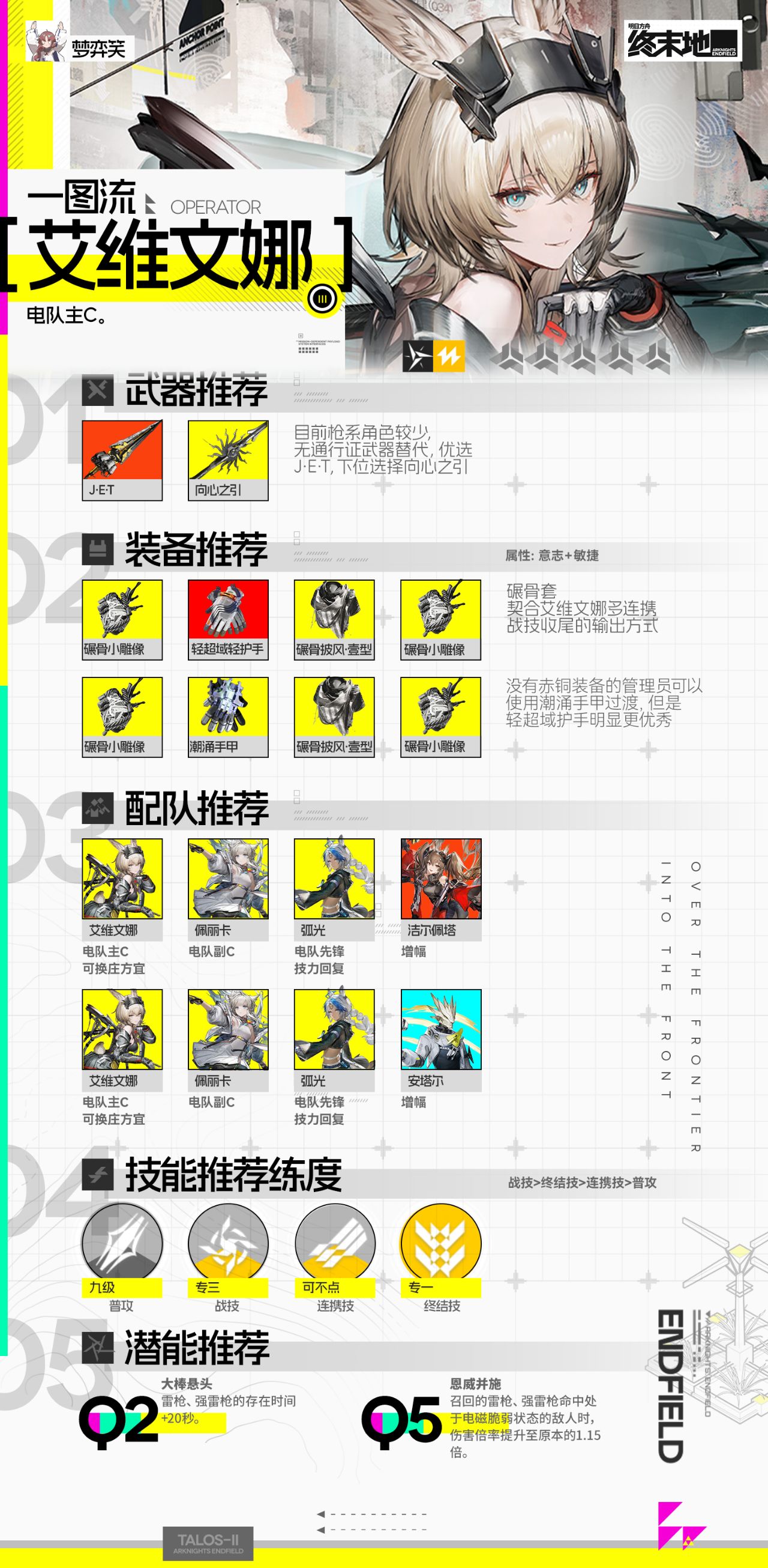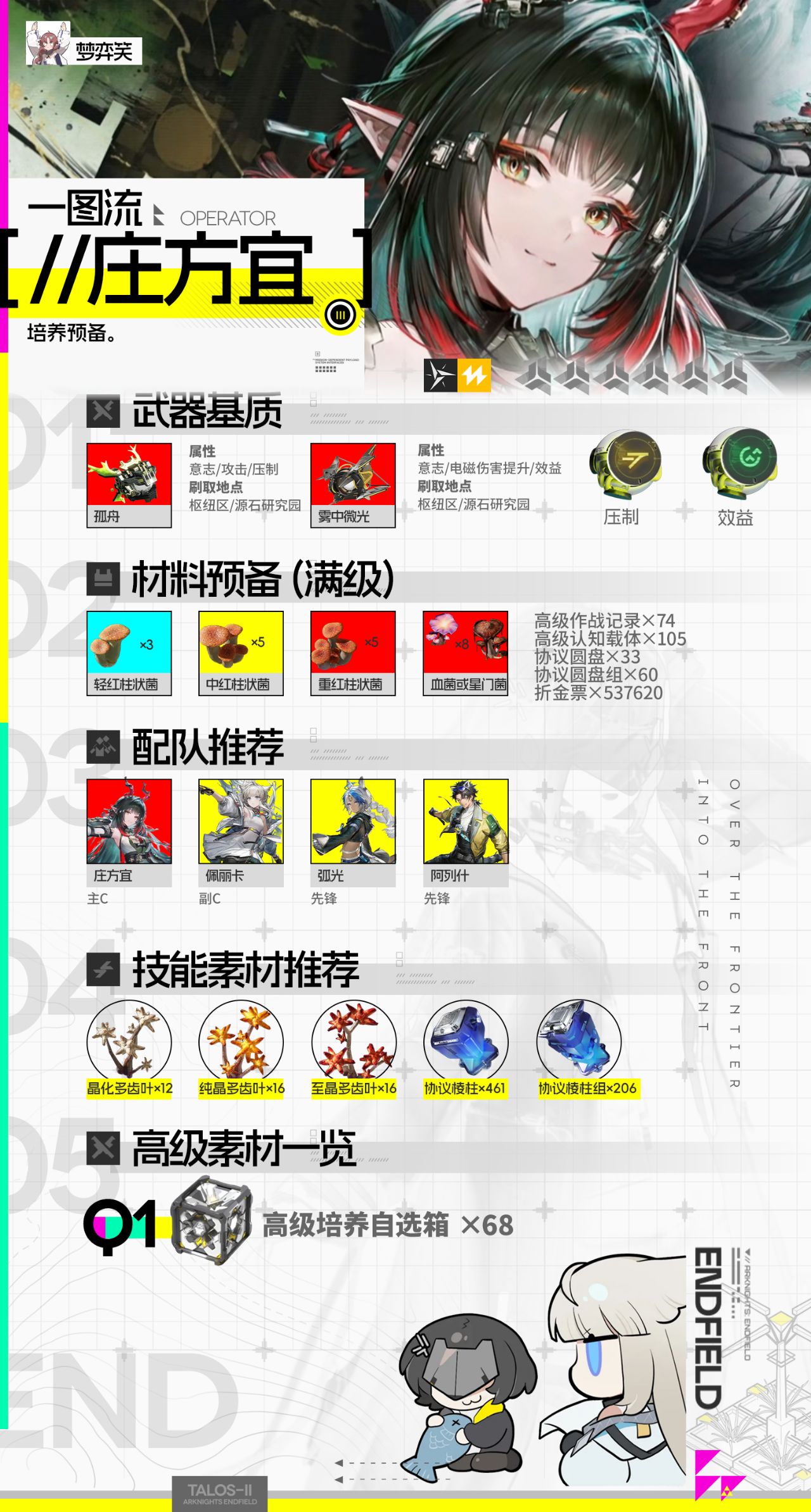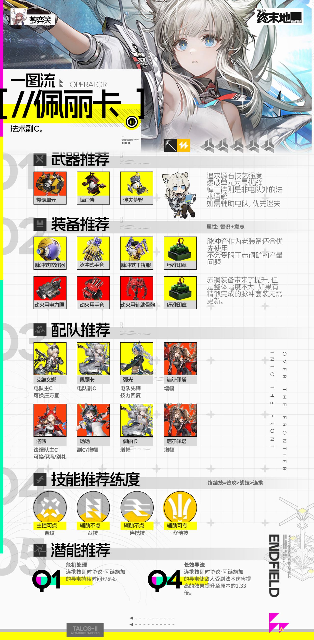建议优先培养弧光,机制比较契合庄方宜,佩丽卡作为通用法术拐也是很有培养价值的,不过加入电队下个版本装备可能有变化,所以除了主属性 装备不建议精锻满。