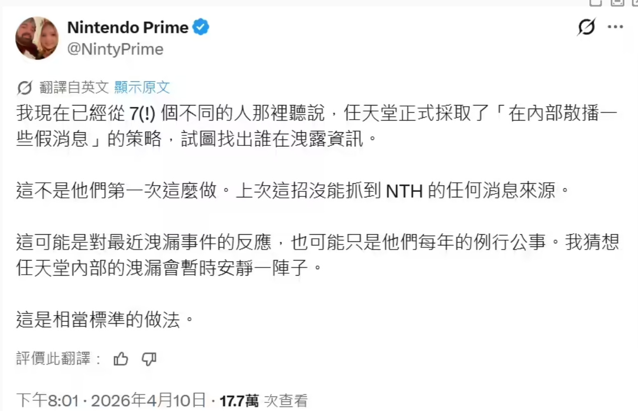 Nintendo Prime還補充了一個圈內冷知識,這種用假消息抓內鬼的手法,在遊戲大廠裏其實很常見。但能成功泄密的員工,都精得很,不會輕易露馬腳。就拿Nate The Hate來說,他從不會聽到消息就立刻發推,而是會等一段時間,多找幾個信源交叉驗證,確認靠譜後纔會爆料。