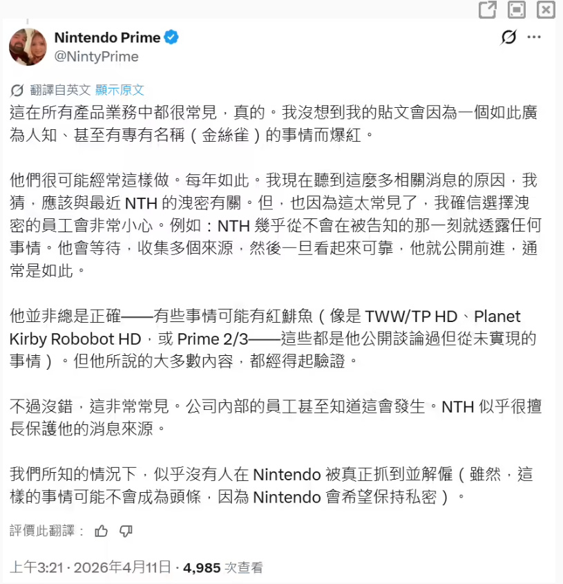 作爲圈內最懂任天堂爆料的人之一,Nintendo Prime直言,這個消息他已經找7個不同渠道覈實過,絕非空穴來風。其實這不是任天堂第一次玩這手,上一輪大規模排查時,就沒能揪出知名爆料人Nate The Hate的消息源,相當於白忙活一場。