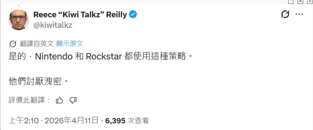 消息一出,另一位圈內消息人士Kiwi Talkz也站出來佐證,他說不止任天堂,連R星也用這種招抓內鬼,這兩家公司對泄密的厭惡程度,堪比玩家討厭肝副本時遇到bug。畢竟對遊戲大廠來說,未公開的新遊細節、硬件計劃,都是核心機密。
