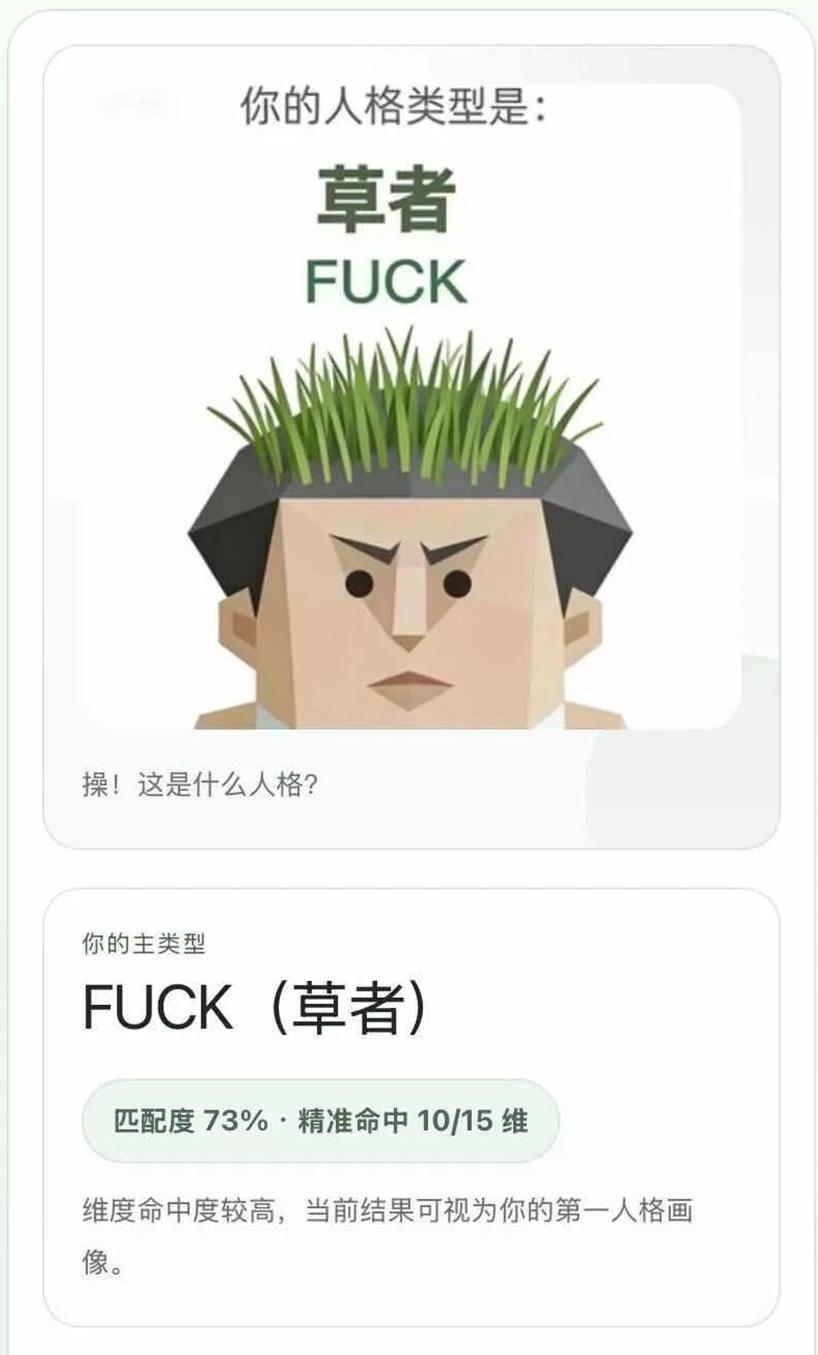 然而,測出如此正面的媽媽型人格,也並不會讓我感到喜悅——我都來測SBTI了,咋就不能抽象點?看看別人的SBTI,這“草者”的身份讓人不由自主地覺得他會當場給我來一個飛天大草,寫一個大寫的F*CK,多爽快、多直白。