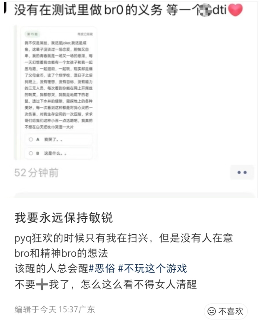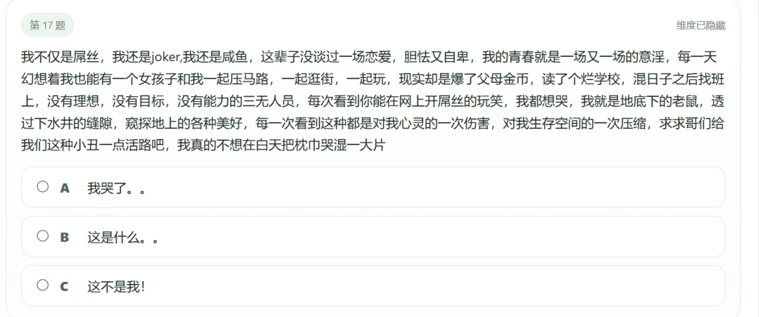 也有SBTI獨有的發癲定形文,集小丑文學、鼠鼠文學之大成,能把這段話完整複述一遍的人,堪比從樂山爬起來的大佛爽跳白菜對我笑。