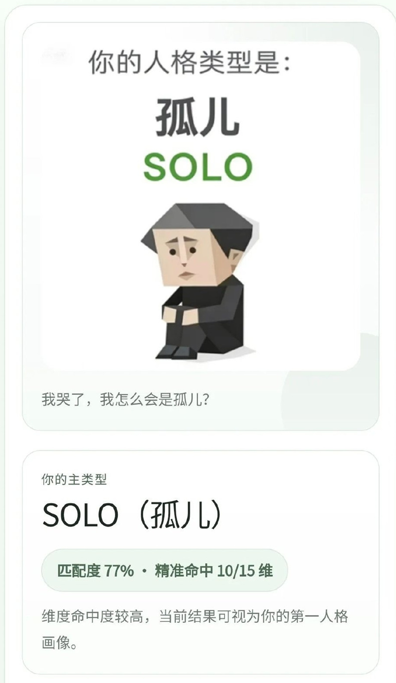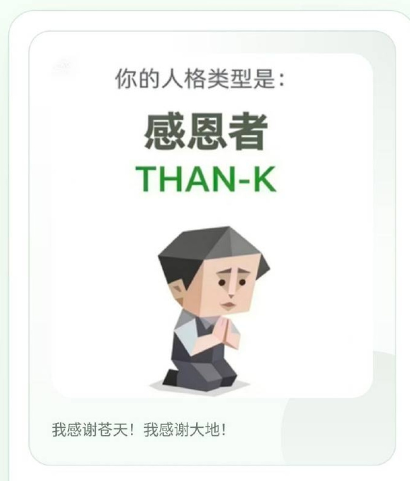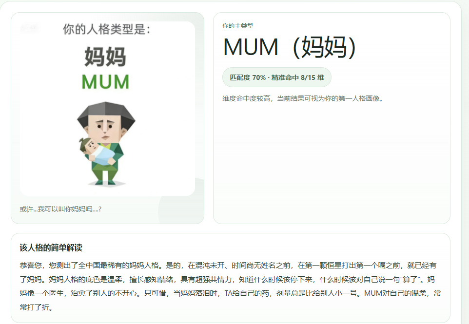 比如,我測出來的人格類型就是每個瓦學弟都想找,被每個堵橋黨當成消耗品的“媽媽”人格。作爲“全中國最稀有的媽媽人格”,在混沌未開、時間尚無姓名之前,在第一顆恆星打出第一個嗝之前,就已經有了媽媽。啊,這個人格是多麼溫柔,多麼正面。