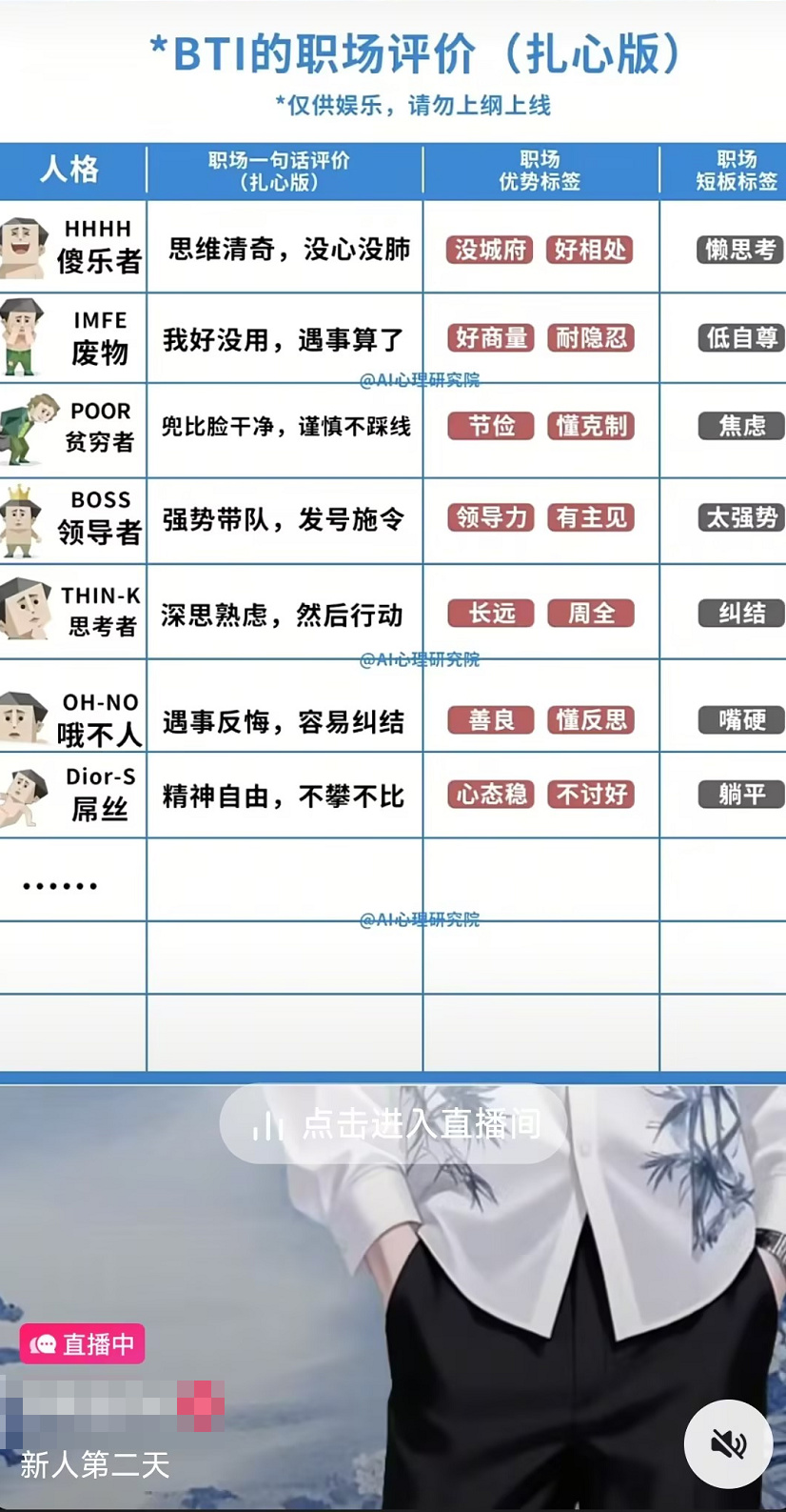 再刷刷直播間,原本那些解讀星座研究心理的專家,也都用SBTI開始一本正經地分析現實問題。