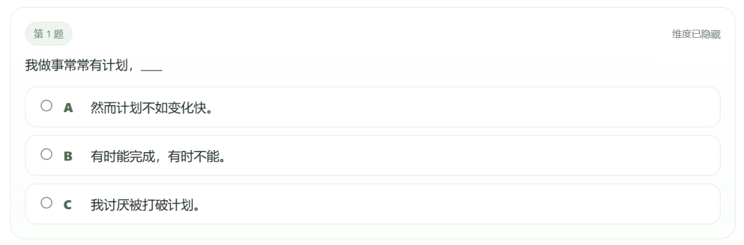 想要挑選自己的人格,你只需要打開那個SBTI網站,然後根據自己的想法隨便在一些問題中進行選擇即可。其中,既有這種經典的劃成分題目,讓人一眼就能看出這是在討論J和P派別的題目。