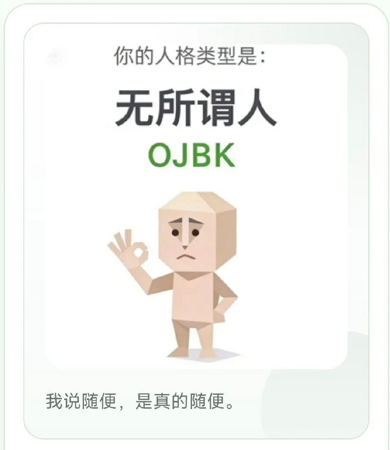 打開社交媒體,有人比如把SBTI上的人格跟MBTI一一對應,幫你硬湊關係,讓你知道“哇偶原來我這個亂選出來的OJBK無所謂人居然是INFJ綠老頭這麼高貴的人格不行我要馬上發個朋友圈”