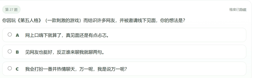 MBTI好歹還用一大堆傳承、一大堆看起來相當正經的題目掩飾一下,SBTI就徹底不演了,直接明牌整活,跟你玩各種各樣的梗,告訴你這就是圖一樂,在娛樂性上一條路走到黑。