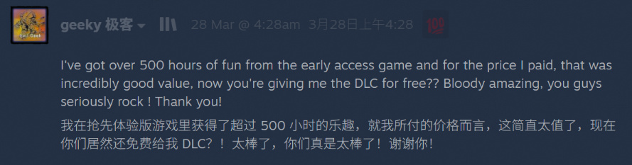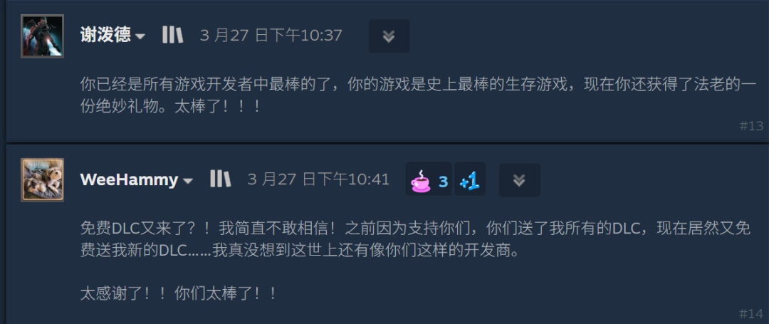 老外們紛紛在評論區留言,語氣裏帶着困惑發出讚美:“你已經是所有遊戲開發者中最棒的了,你的遊戲是史上最棒的生存遊戲,現在居然又免費送我新的DLC……我真沒想到這世上還有像你們這樣的開發商。你們太棒了!!”甚至有玩家擔心,送一個月時間有點太長了,只送一週行不行?難道這幫中國的開發者,不知道賣DLC是能賺錢的嗎?