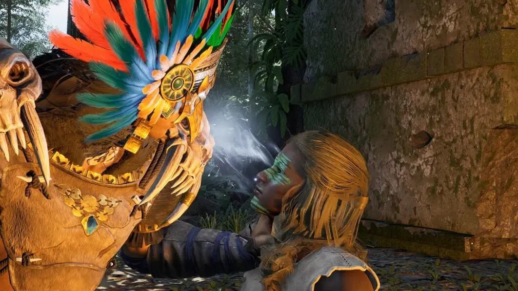 那這遊戲是玩啥的呢?首先,它是一個圍繞中美洲阿茲特克文明的,開放世界生存建造遊戲,體量非常龐大,甚至有數萬玩家的遊戲時長超過了1000個小時,可以看出這遊戲的耐玩性有多誇張了。而對玩家來說,遊戲真正的主角,不是你操作的那個人,而是一副可以靈魂附身任何人的面甲。你需要用這幅面甲去招募族人,壯大你的部落