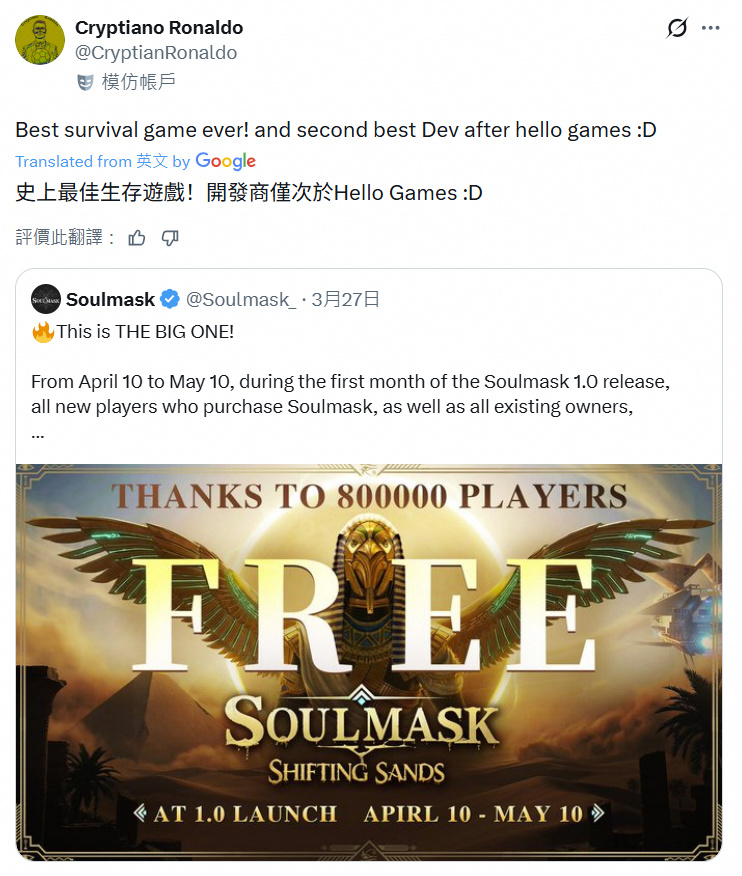 歐美玩家稱讚爲“最好的生存遊戲”,甚至將開發團隊和9年更新的《無人深空》開發團隊Hello Games一起提及