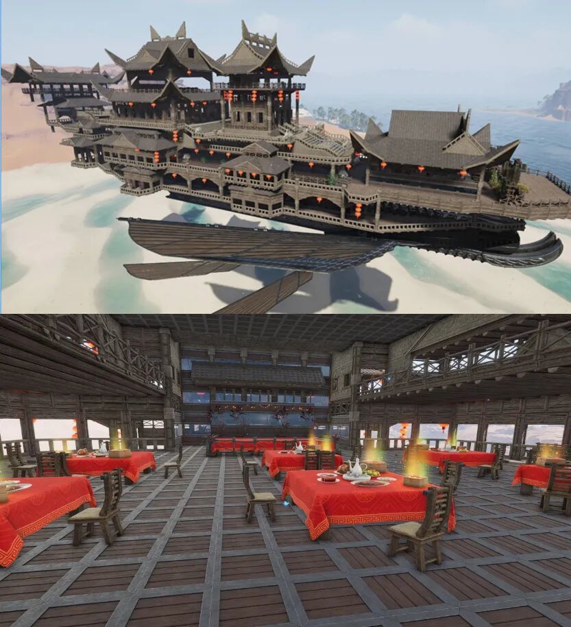中國玩家“遲到同學”則造了一艘能飛的巨型國風閣樓。全原木搭建,沒有一塊石頭,船內還有寬敞的宴會廳,讓族人們幹完活能一起喫飯——他說這不是爲了功能,是爲了“美”。